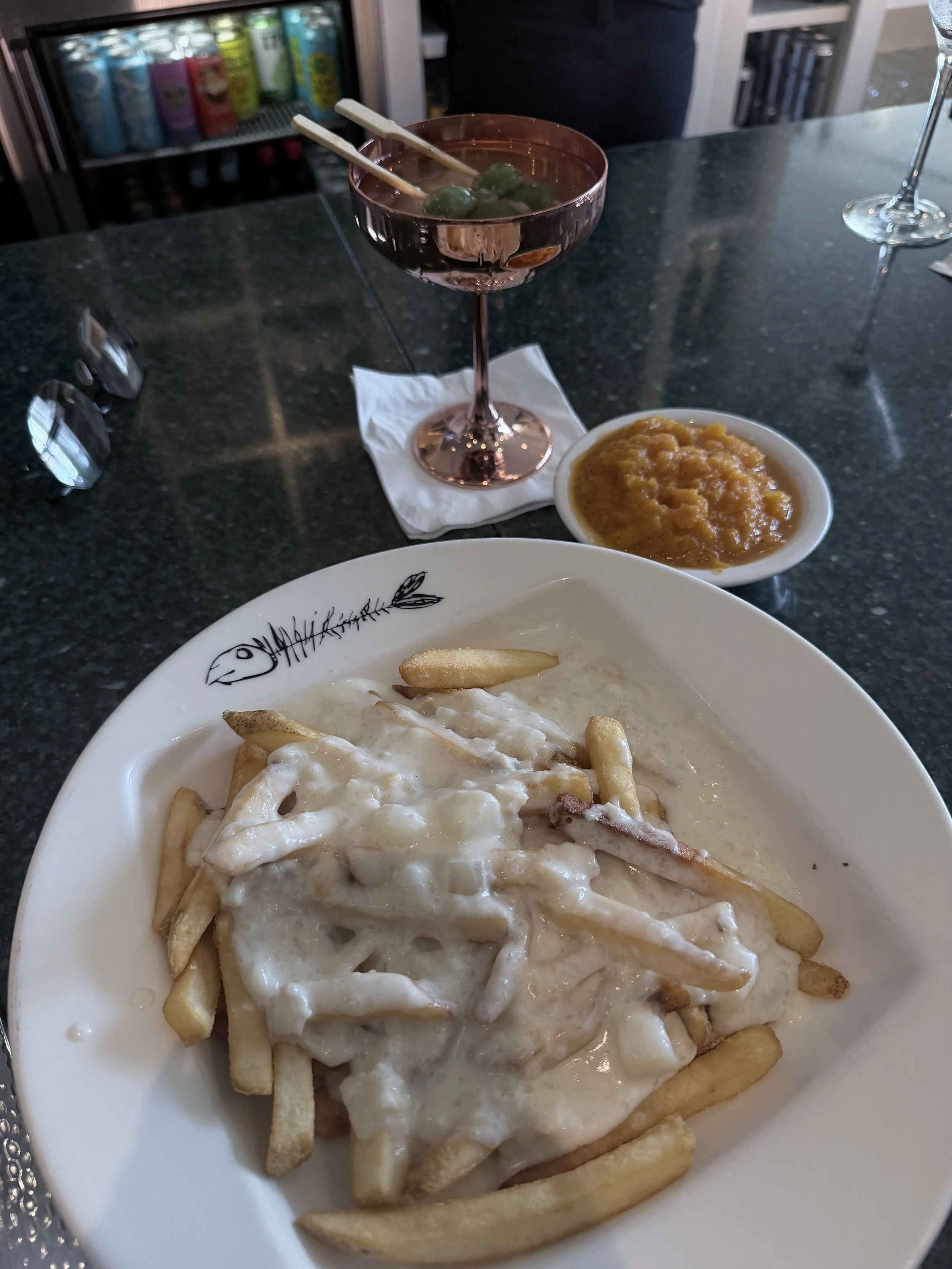 Snagged my favorite bartender Jess and while not on the menu I got fries with clam chowder dumped right on top. Made my day.